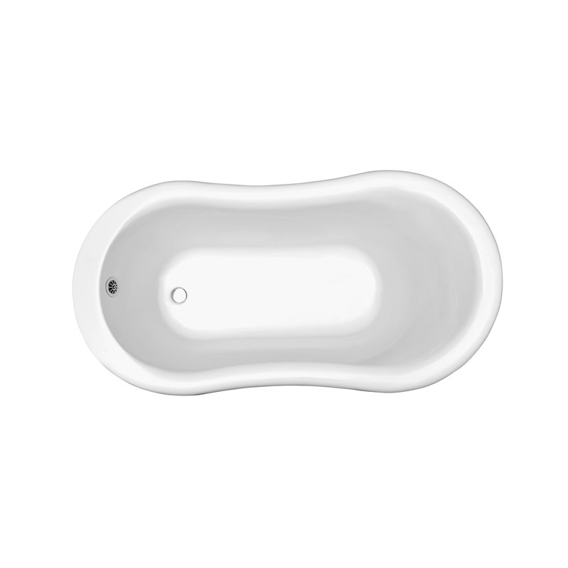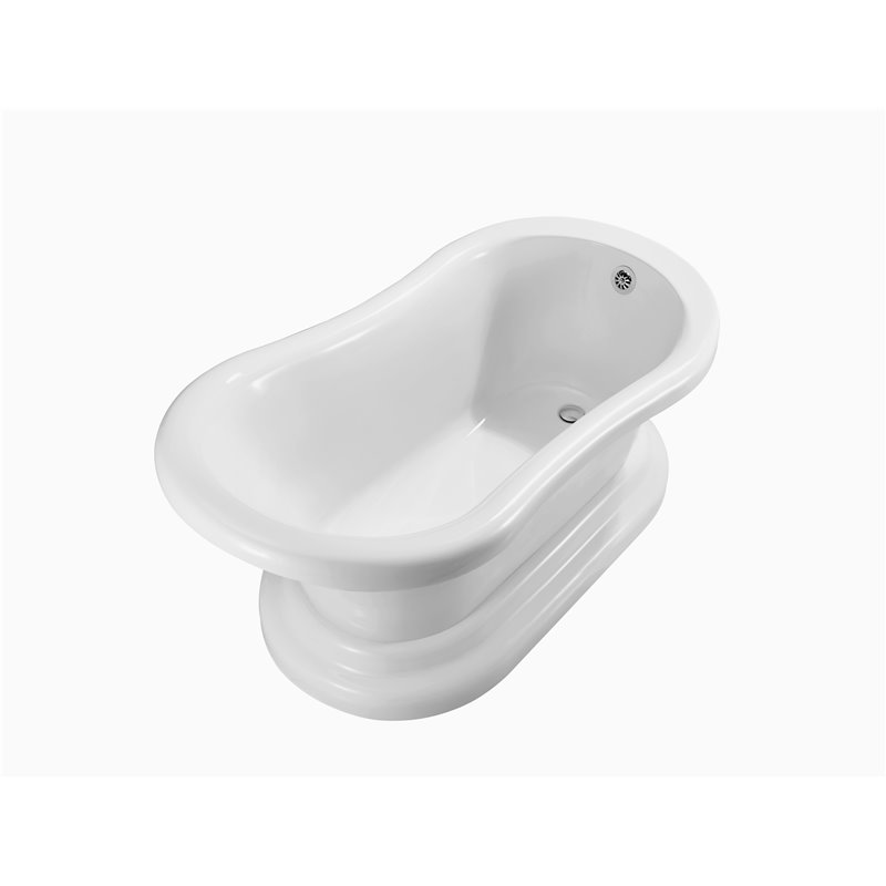 Relax in this Streamline 60” glossy white modern pedestal bathtub. Its unique wedged style design gives your back the support it needs to soak in comfort. This freestanding tub has an external chrome colored drain and can hold up to 100 gallons of water.