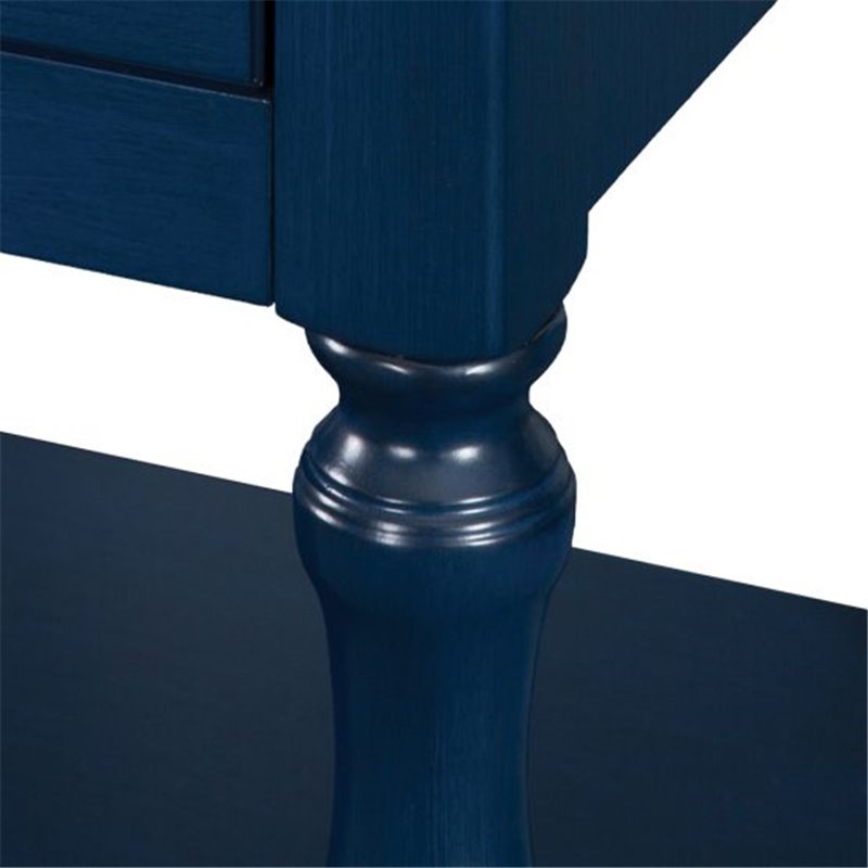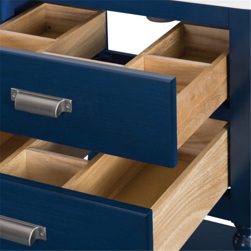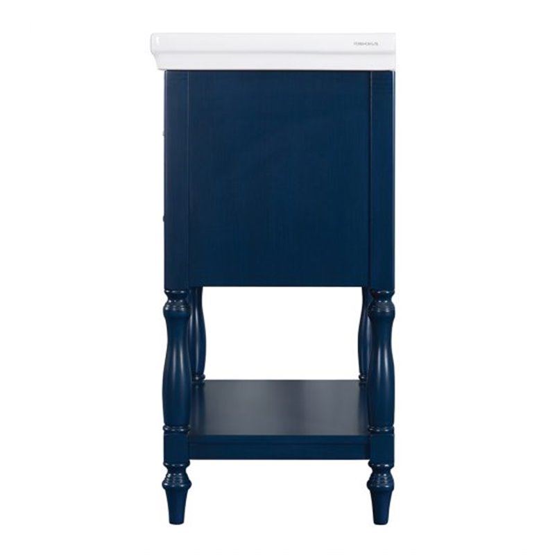 Don’t neglect the small spaces. Focus on the details and bring elegance into your small bathroom with Cherie Vanity Combo. This vanity combo makes installation simple with an included vitreous china integrated sink top and adjustable leg levelers. The Cherie Vanity maximizes storage space with two u-shape drawers with compartment boxes, and an open bottom shelf to give you the space for towels and other larger items. Featuring turned legs, cup style handles, and a rich royal blue finish, the bold and unique design on the Cherie Vanity will elevate your bathroom to the next level.
