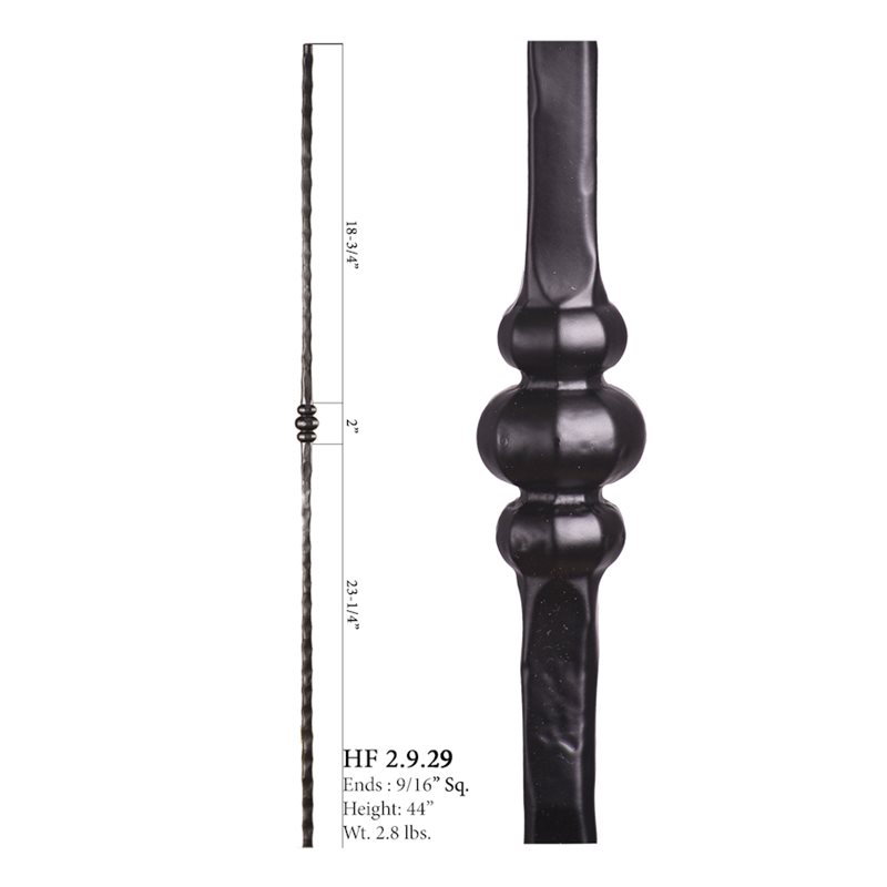 The 2.9.29 is a Satin Black Tuscan Square series single knuckle baluster. It measures 44" tall, 9/16" square on the ends, and weighs a total of 2.8 lbs.