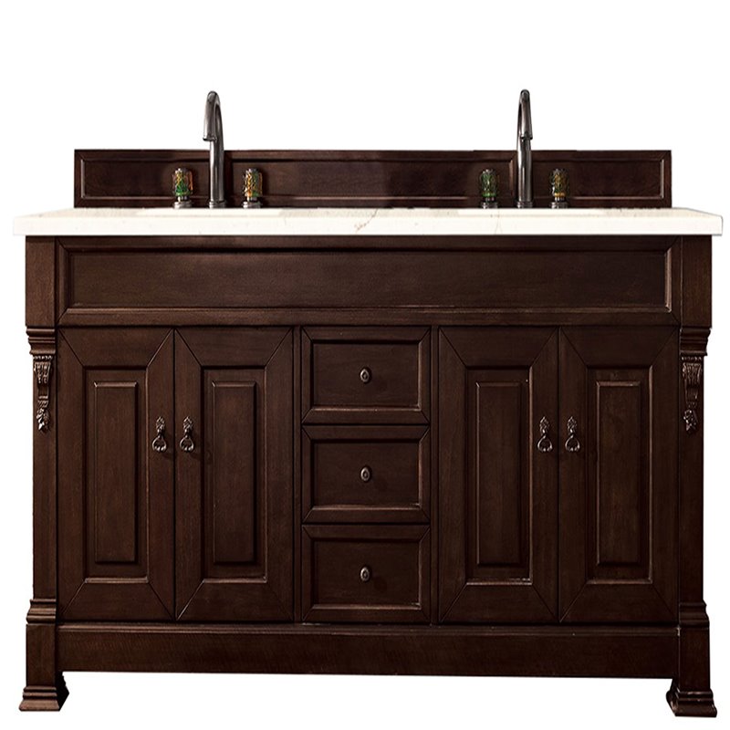 | Feature 1 | Four door Burnished Mahogany double vanity cabinet with three drawers and interior shelf space |
