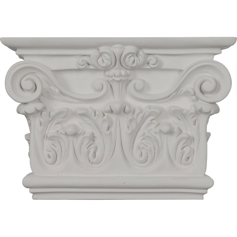 10 3/8 inch W x 7 1/2 inch H x 2 5/8 inch P Artis Onlay Capital. Our appliques and onlays are the perfect accent pieces to cabinetry furniture fireplace mantels ceilings and more. Each pattern is carefully crafted after traditional and historical designs. Each polyurethane piece is easily installed just like wood pieces with simple glues and finish nails. Another benefit of polyurethane is it will not rot or crack and is impervious to insect manifestations. It comes to you factory primed and ready for your paint faux finish gel stain marbleizing and more.