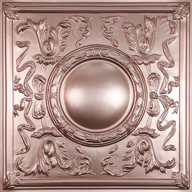 "Bella Copper Ceiling Tiles allow you to create a classic Greek Revival ceiling effortlessly. Their faux copper finish bestows a warm luster. 2' x 2' Copper Can be mounted directly to your ceiling using adhesive installed in both standard 1"" and slimline 9/16"" drop ceiling grid or placed beneath existing tiles to reface your outdated ceiling. Made from laminated 0.030"" thick rigid vinyl plastic. Lightweight and flexible for easy installation."