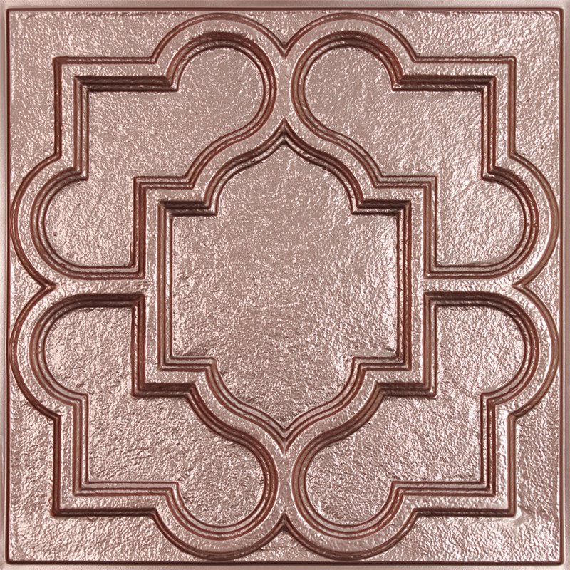 "Victorian Copper Ceiling Tiles reproduce the look and feel of handmade metal ceiling tiles. Their faux copper finish bestows a warm luster. 2' x 2' Copper. Can be installed in standard 1"" drop ceiling grid. Made from laminated 0.013"" thick rigid vinyl plastic. Lightweight and flexible for easy installation."