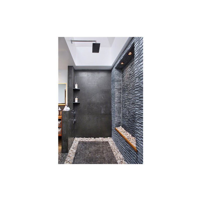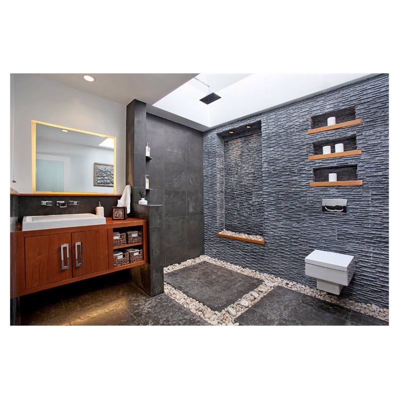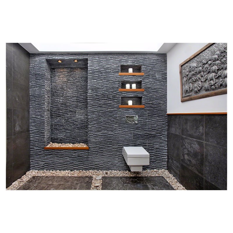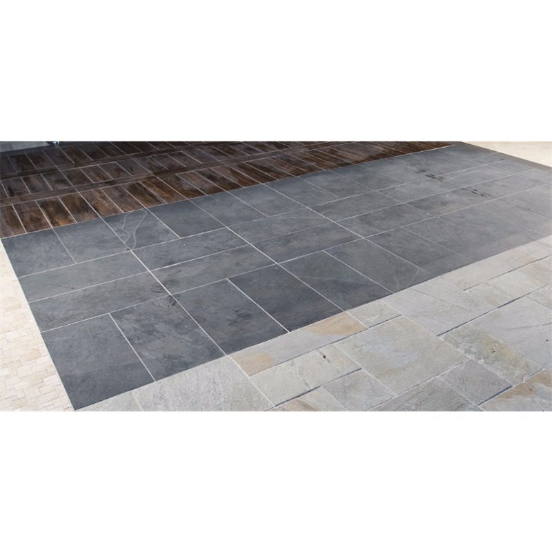 Montauk Black slate tiles are available in a wide variety of tile sizes and has low variations and veining of blacks and greens. It is available in gauged honed and natural finishes and recommended for exterior projects for flooring countertops and walls.