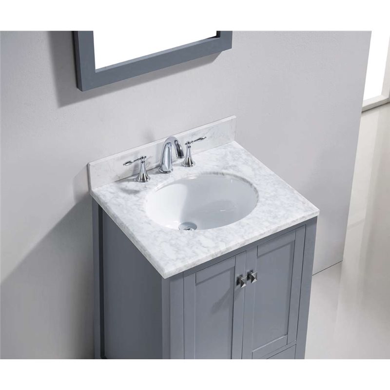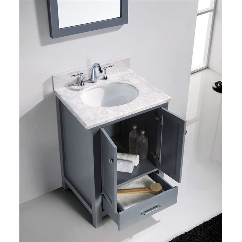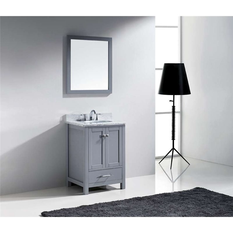 The Caroline Avenue series is designed with a bold clean style and built with strong, top notch materials including designer brushed nickel hardware. It offers an abundance of storage space and state of the art technology with its soft closing doors and drawers. Featuring a high quality solid oak wood with a modern, zero-emissions, grey finish that will last for years to come. With this vanity's Italian Carrara White Marble countertop, it will be more durable and resistant to mishaps. Virtu USA has taken the initiative by changing the vanity industry and adding soft closing doors and drawers to their entire product line. The premium soft-closing hardware not only increases the safety of the vanity, but also its lifetime reliability.Specifications: • Maximum Dimension: 24 in. W x 22 in. D x 40.3 in. H • Main Cabinet (1): 23.3 in. W x 21.65 in. D x 39.1 in. H • Full Framed Mirror (1): 23.6 in. W x 31.5 in. H • Backsplash (1): 24 in. W x 0.6 in. D x 3.9 in. H Features: • Italian Carrara White Marble Countertop • 1.2 in. countertop edge thickness • Grey Cabinet Finish • Grey Full Framed Mirror finish • Solid Oak Wood • Water Resistant Low V.O.C Sealer • Adjustable hinges and slides • 2 Doors with Concealed Hinges • 1 Drawer with Soft Closing Hinges • Designer Chrome Handles with Satin Nickel Highlights & Brushed Nickel Knobs • Under-mount ceramic basin with overflow • Standard 8-inch Widespread Pre-Drilled Holes • Faucet sold separately • Minimal assembly required