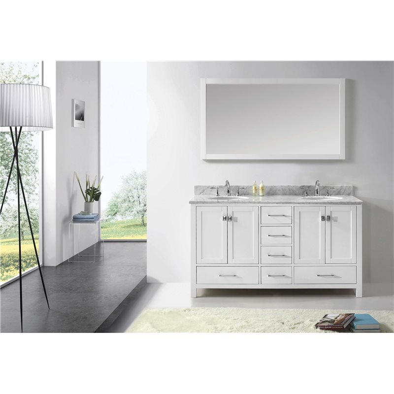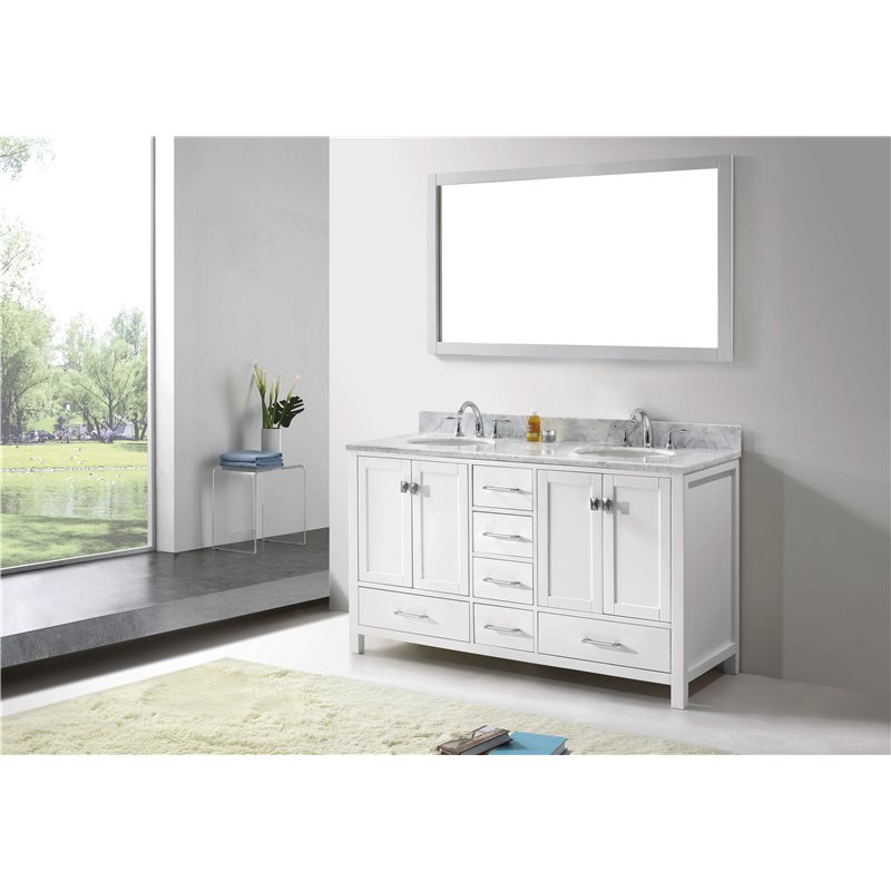 The Caroline Avenue series is designed with a bold clean style and built with strong, top notch materials including designer brushed nickel hardware. It offers an abundance of storage space and state of the art technology with its soft closing doors and drawers. Featuring a high quality solid oak wood with an elegant, zero-emissions, white finish that will last for years to come. With this vanity's Italian Carrara White Marble countertop, it will be more durable and resistant to mishaps. Virtu USA has taken the initiative by changing the vanity industry and adding soft closing doors and drawers to their entire product line. The premium soft-closing hardware not only increases the safety of the vanity, but also its lifetime reliability.Specifications: • Maximum Dimension: 60 in. W x 22 in. D x 34.25 in. H • Main Cabinet (1): 59.2 in. W x 21.65 in. D x 33.5 in. H • Full Framed Mirror (1): 59.1 in. W x 31.5 in. H • Backsplash (1): 60 in. W x 0.6 in. D x 3.9 in. H Features: • Italian Carrara White Marble Countertop • 0.75 in. countertop edge thickness • White Cabinet Finish • White Full Framed Mirror finish • Solid Oak Wood • Water Resistant Low V.O.C Sealer • Adjustable hinges and slides • 4 Doors with Concealed Hinges • 4 Drawers with Soft Closing Hinges • Designer Chrome Handles with Satin Nickel Highlights & Brushed Nickel Knobs • Under-mount ceramic basin with overflow • Standard 8-inch Widespread Pre-Drilled Holes • Faucet sold separately • Minimal assembly required