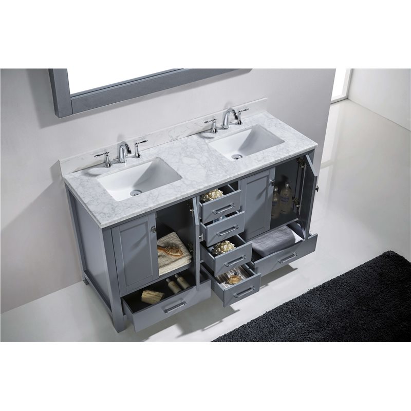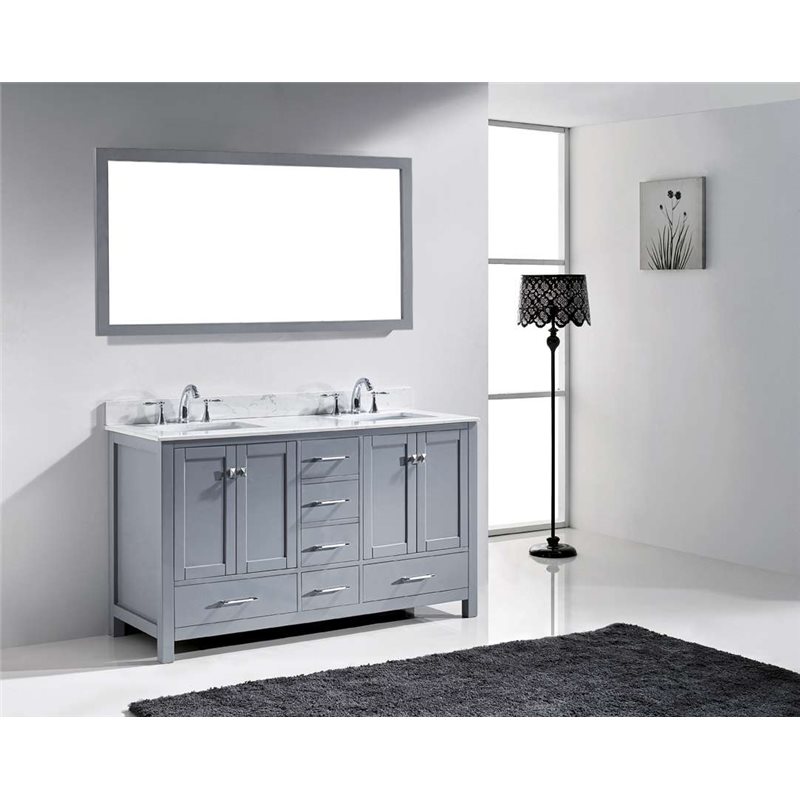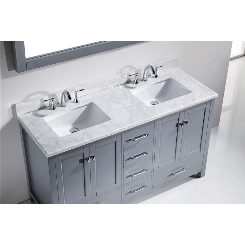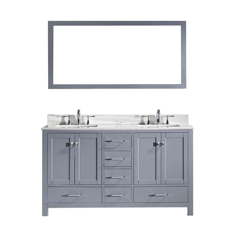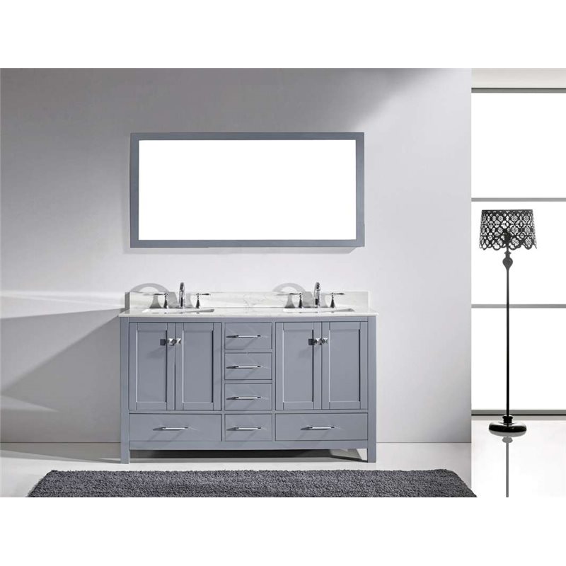 The Caroline Avenue series is designed with a bold clean style and built with strong, top notch materials including designer brushed nickel hardware. It offers an abundance of storage space and state of the art technology with its soft closing doors and drawers. Featuring a high quality solid oak wood with a modern, zero-emissions, grey finish that will last for years to come. With this vanity's Italian Carrara white Marble countertop, it will be more durable and resistant to mishaps. Virtu USA has taken the initiative by changing the vanity industry and adding soft closing doors and drawers to their entire product line. The premium soft-closing hardware not only increases the safety of the vanity, but also its lifetime reliability.Specifications: • Maximum Dimension: 60 in. W x 22 in. D x 34.25 in. H • Main Cabinet (1): 59.2 in. W x 21.65 in. D x 33.5 in. H • Full Framed Mirror (1): 59.1 in. W x 31.5 in. H • Backsplash (1): 60 in. W x 0.6 in. D x 3.9 in. H Features: • Italian Carrara White Marble Countertop • 0.75 in. countertop edge thickness • Grey Cabinet Finish • Grey Full Framed Mirror finish • Solid Oak Wood • Water Resistant Low V.O.C Sealer • Adjustable hinges and slides • 4 Doors with Concealed Hinges • 4 Drawers with Soft Closing Hinges • Designer Chrome Handles with Satin Nickel Highlights & Brushed Nickel Knobs • Under-mount ceramic basin with overflow • Standard 8-inch Widespread Pre-Drilled Holes • Faucet sold separately • Minimal assembly required