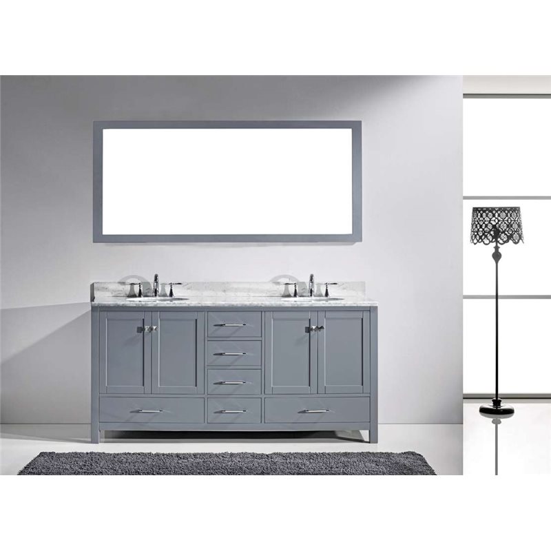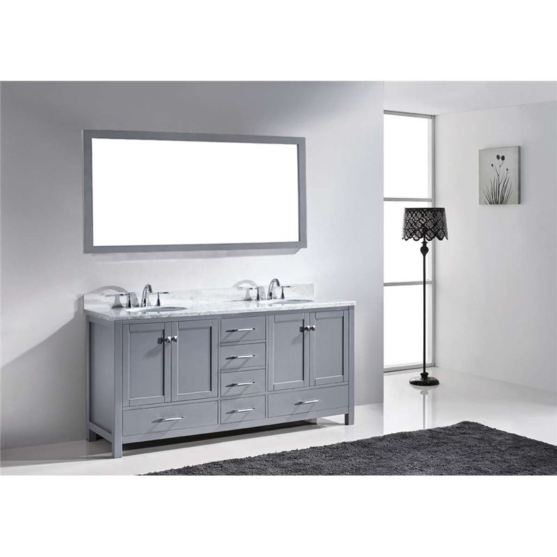 The Caroline Avenue series is designed with a bold clean style and built with strong, top notch materials including designer brushed nickel hardware. It offers an abundance of storage space and state of the art technology with its soft closing doors and drawers. Featuring a high quality solid oak wood with a modern, zero-emissions, grey finish that will last for years to come. With this vanity's Italian Carrara white Marble countertop, it will be more durable and resistant to mishaps. Virtu USA has taken the initiative by changing the vanity industry and adding soft closing doors and drawers to their entire product line. The premium soft-closing hardware not only increases the safety of the vanity, but also its lifetime reliability.Specifications: • Maximum Dimension: 72 in. W x 22 in. D x 34.2 in. H • Main Cabinet (1): 71.18 in. W x 21.65 in. D x 33.45 in. H • Full Framed Mirror (1): 71 in. W x 31.5 in. H • Backsplash (1): 72 in. W x 0.6 in. D x 3.9 in. H Features: • Italian Carrara White Marble Countertop • 0.75 in. countertop edge thickness • Grey Cabinet Finish • Grey Full Framed Mirror finish • Solid Oak Wood • Water Resistant Low V.O.C Sealer • Adjustable hinges and slides • 4 Doors with Concealed Hinges • 6 Drawers with Soft Closing Hinges • Designer Chrome Handles with Satin Nickel Highlights & Brushed Nickel Knobs • Under-mount ceramic basin with overflow • Standard 8-inch Widespread Pre-Drilled Holes • Faucet sold separately • Minimal assembly required