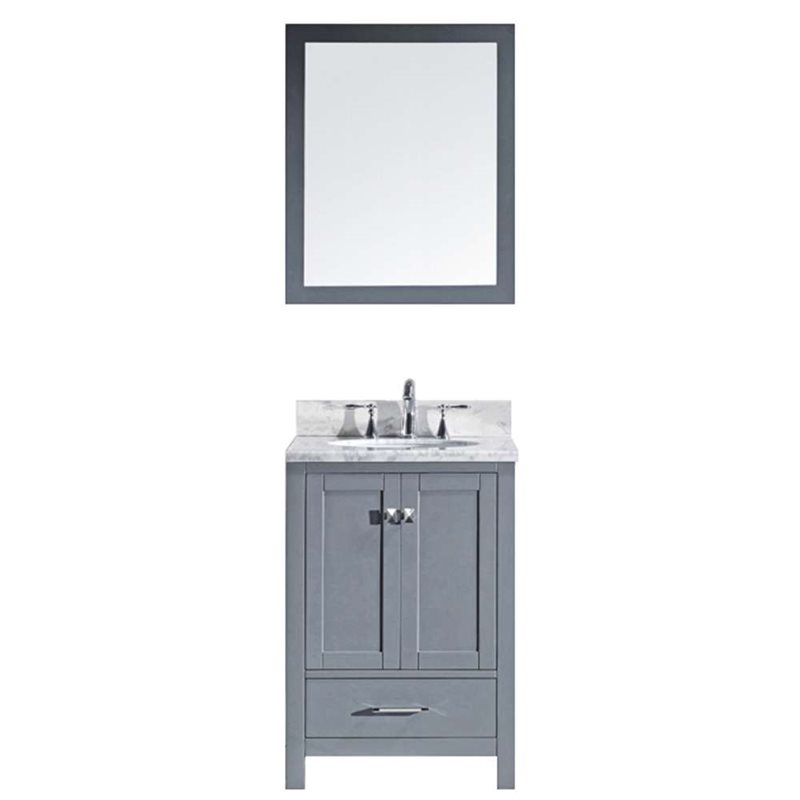 The Caroline Avenue series is designed with a bold clean style and built with strong, top notch materials including designer brushed nickel hardware. It offers an abundance of storage space and state of the art technology with its soft closing doors and drawers. Featuring a high quality solid oak wood with a modern, zero-emissions, grey finish that will last for years to come. With this vanity's Italian Carrara White Marble countertop, it will be more durable and resistant to mishaps. Virtu USA has taken the initiative by changing the vanity industry and adding soft closing doors and drawers to their entire product line. The premium soft-closing hardware not only increases the safety of the vanity, but also its lifetime reliability.Specifications: • Maximum Dimension: 24 in. W x 22 in. D x 40.3 in. H • Main Cabinet (1): 23.3 in. W x 21.65 in. D x 39.1 in. H • Full Framed Mirror (1): 23.6 in. W x 31.5 in. H • Backsplash (1): 24 in. W x 0.6 in. D x 3.9 in. H Features: • Italian Carrara White Marble Countertop • 1.2 in. countertop edge thickness • Grey Cabinet Finish • Grey Full Framed Mirror finish • Solid Oak Wood • Water Resistant Low V.O.C Sealer • Adjustable hinges and slides • 2 Doors with Concealed Hinges • 1 Drawer with Soft Closing Hinges • Designer Chrome Handles with Satin Nickel Highlights & Brushed Nickel Knobs • Under-mount ceramic basin with overflow • Standard 8-inch Widespread Pre-Drilled Holes • PS-265 Brushed Nickel faucet included • Minimal assembly required