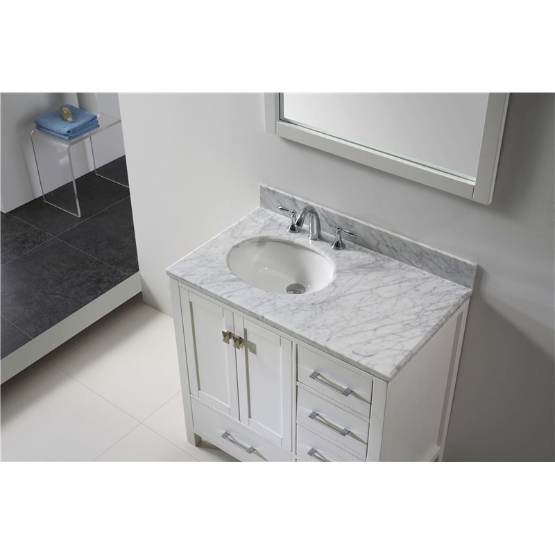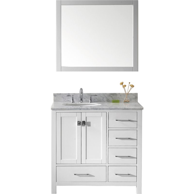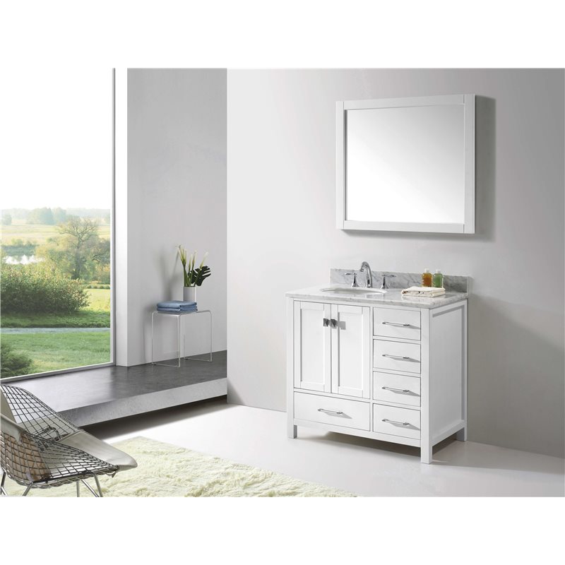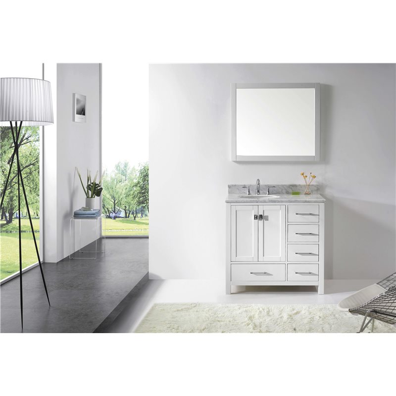 The Caroline Avenue series is designed with a bold clean style and built with strong, top notch materials including designer brushed nickel hardware. It offers an abundance of storage space and state of the art technology with its soft closing doors and drawers. Featuring a high quality solid oak wood with an elegant, zero-emissions, white finish that will last for years to come. With this vanity's Italian Carrara White Marble countertop, it will be more durable and resistant to mishaps. Virtu USA has taken the initiative by changing the vanity industry and adding soft closing doors and drawers to their entire product line. The premium soft-closing hardware not only increases the safety of the vanity, but also its lifetime reliability.Specifications: • Maximum Dimension: 36 in. W x 22 in. D x 34.66 in. H • Main Cabinet (1): 35.2 in. W x 21.65 in. D x 33.46 in. H • Full Framed Mirror (1): 35.4 in. W x 31.5 in. H • Backsplash (1): 36 in. W x 0.6 in. D x 3.9 in. H Features: • Italian Carrara White Marble Countertop • 1.2 in. countertop edge thickness • White Cabinet Finish • White Full Framed Mirror finish • Solid Oak Wood • Water Resistant Low V.O.C Sealer • Adjustable hinges and slides • 2 Doors with Concealed Hinges • 5 Drawers with Soft Closing Hinges • Designer Chrome Handles with Satin Nickel Highlights & Brushed Nickel Knobs • Under-mount ceramic basin with overflow • Standard 8-inch Widespread Pre-Drilled Holes • Faucet sold separately • Minimal assembly required