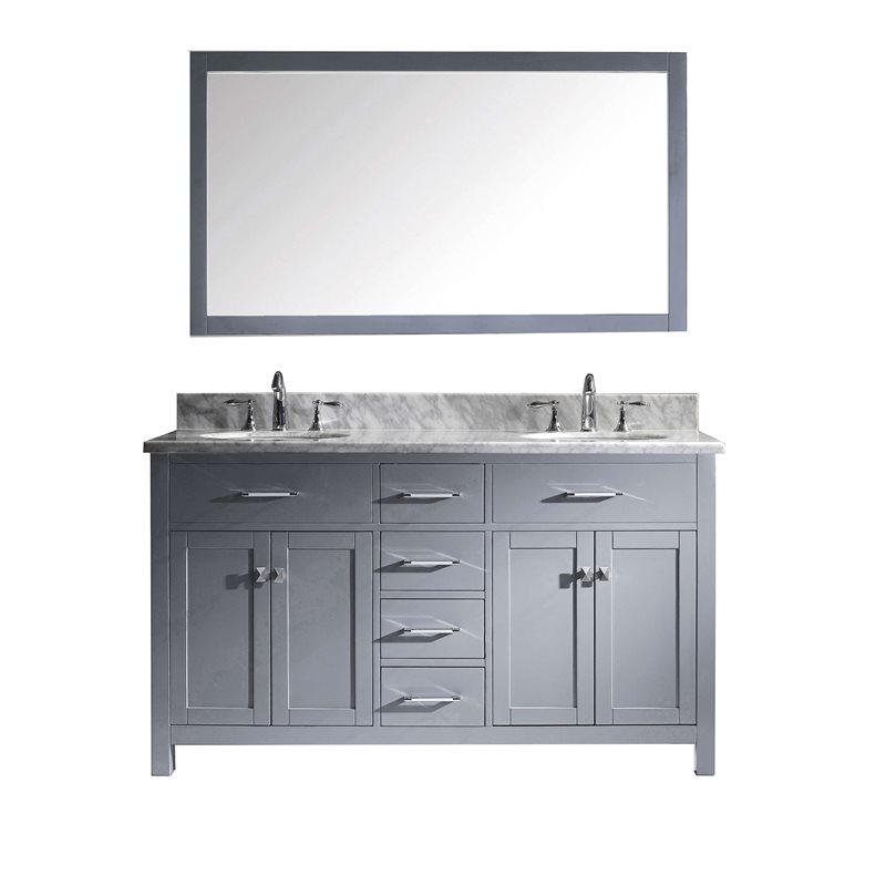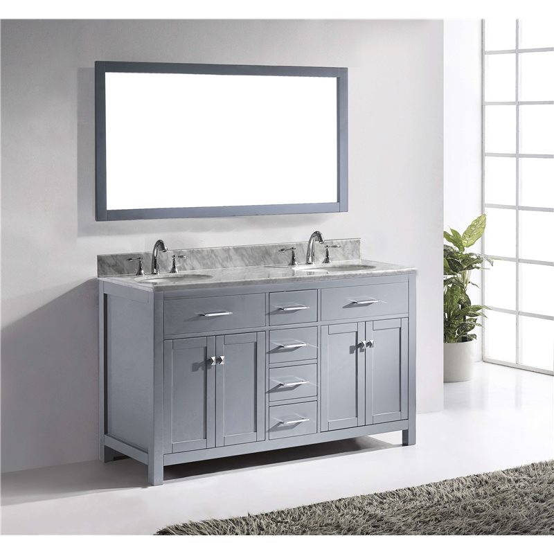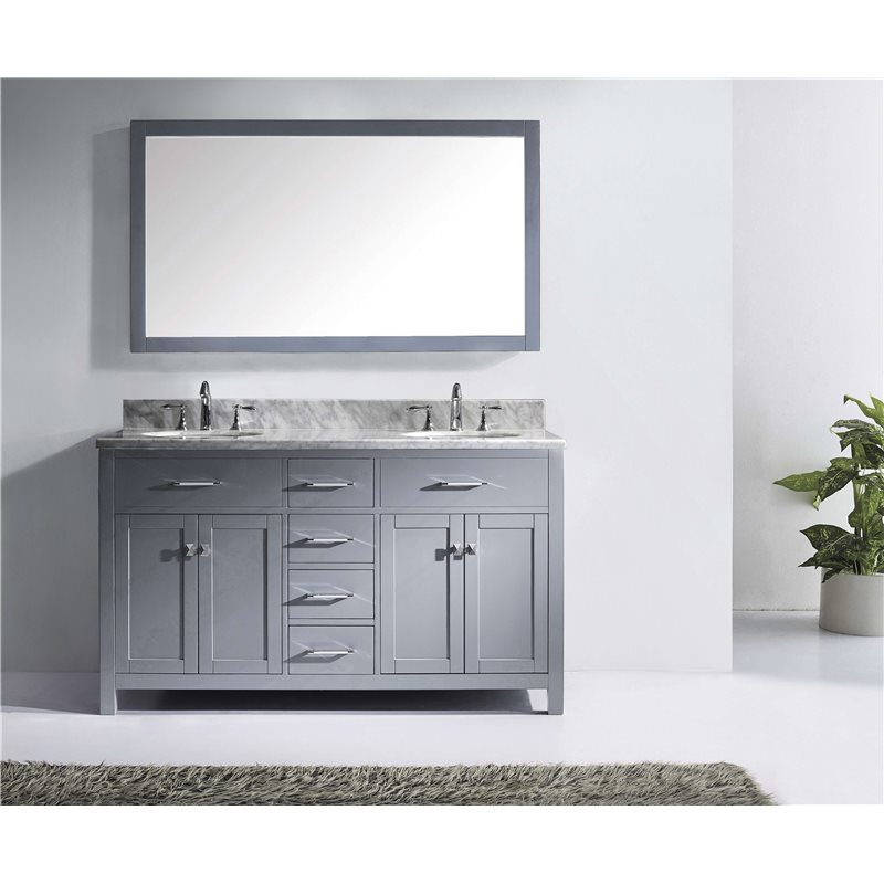The Caroline collection has a beautiful, clean design that will rejuvenate any bathroom. It is constructed from a high quality solid oak wood, finished in a modern, zero-emissions, grey finish and equipped with state of the art, soft closing door and drawer technology. Take notice in the beautiful Italian Carrara white Marble that's sheer size alone with guarantee that it will outlast the rest.Virtu USA has taken the initiative by changing the vanity industry and adding soft closing doors and drawers to their entire product line. The premium soft-closing hardware not only increases the safety of the vanity, but also its lifetime reliability.Specifications: • Maximum Dimension: 60 in. W x 22 in. D x 34.21 in. H • Main Cabinet (1): 59.2 in. W x 21.7 in. D x 33.46 in. H • Full Framed Mirror (1): 59.1 in. W x 31.5 in. H • Backsplash (1): 60 in. W x 0.6 in. D x 3.9 in. H Features: • Italian Carrara White Marble Countertop • 0.75 in. countertop edge thickness • Grey Cabinet Finish • Grey Full Framed Mirror finish • Solid Oak Wood • Water Resistant Low V.O.C Sealer • Adjustable hinges and slides • 4 Doors with Concealed Hinges • 4 Drawers with Soft Closing Hinges • Designer Chrome Handles with Satin Nickel Highlights & Brushed Nickel Knobs • Under-mount ceramic basin with overflow • Standard 8-inch Widespread Pre-Drilled Holes • Faucet sold separately • Minimal assembly required
