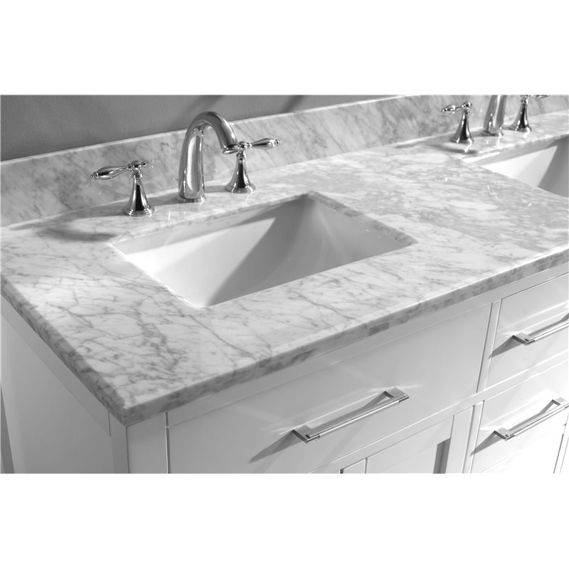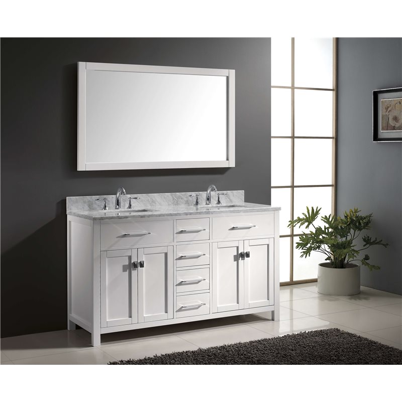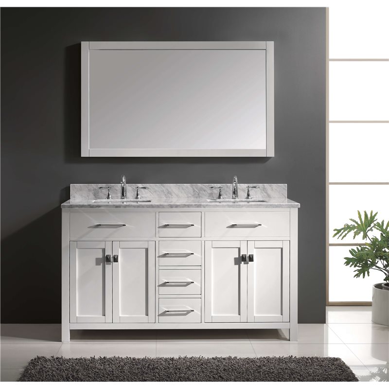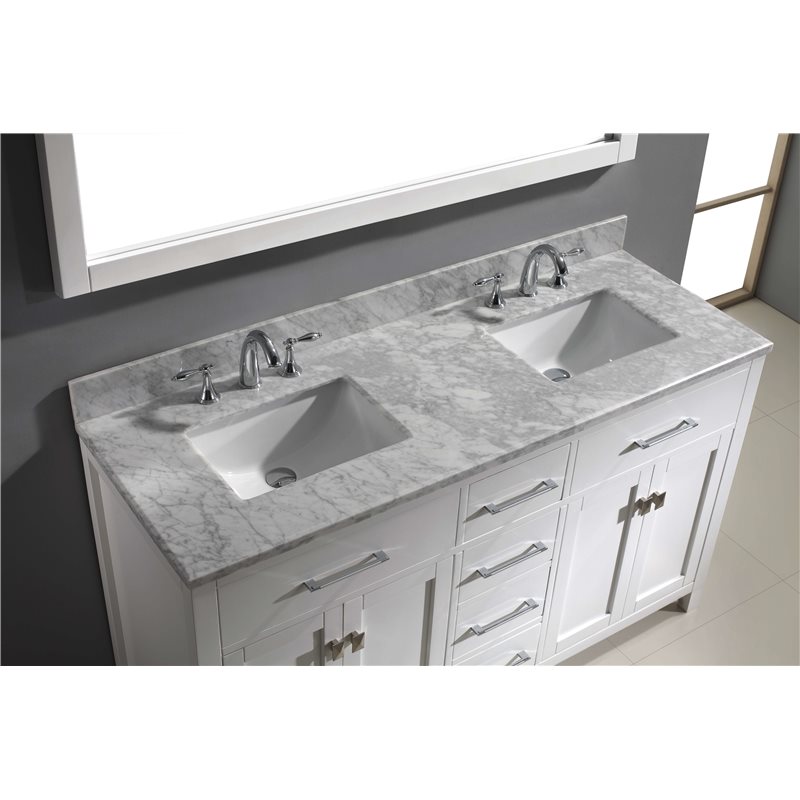 The Caroline collection has a beautiful, clean design that will rejuvenate any bathroom. It is constructed from a high quality solid oak wood, finished in an elegant white and equipped with state of the art, soft closing door and drawer technology. Take notice in the beautiful Italian Carrara White Marble that's sheer size alone with guarantee that it will outlast the rest.Virtu USA has taken the initiative by changing the vanity industry and adding soft closing doors and drawers to their entire product line. The premium soft-closing hardware not only increases the safety of the vanity, but also its lifetime reliability.Specifications: • Maximum Dimension: 60 in. W x 22 in. D x 34.21 in. H • Main Cabinet (1): 59.2 in. W x 21.7 in. D x 33.46 in. H • Full Framed Mirror (1): 59.1 in. W x 31.5 in. H • Backsplash (1): 60 in. W x 0.6 in. D x 3.9 in. H Features: • Italian Carrara White Marble Countertop • 0.75 in. countertop edge thickness • White Cabinet Finish • White Full Framed Mirror finish • Solid Oak Wood • Water Resistant Low V.O.C Sealer • Adjustable hinges and slides • 4 Doors with Concealed Hinges • 4 Drawers with Soft Closing Hinges • Designer Chrome Handles with Satin Nickel Highlights & Brushed Nickel Knobs • Under-mount ceramic basin with overflow • Standard 8-inch Widespread Pre-Drilled Holes • Faucet sold separately • Minimal assembly required