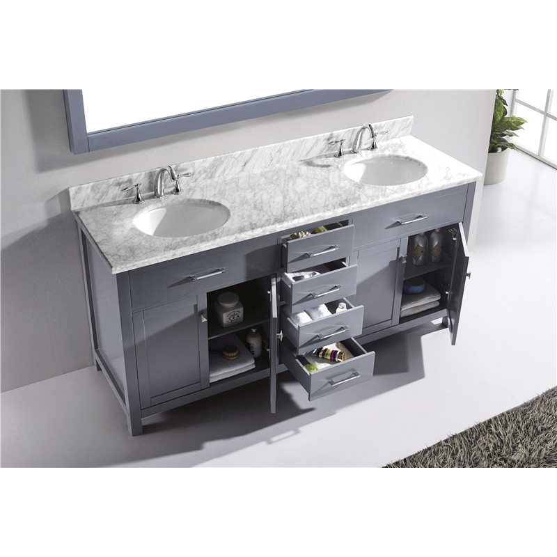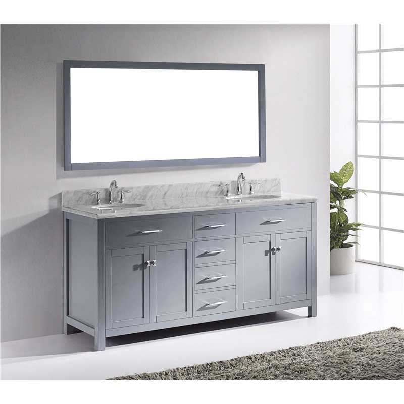 The Caroline collection has a beautiful, clean design that will rejuvenate any bathroom. It is constructed from a high quality solid oak wood, finished in a modern, zero-emissions, grey finish and equipped with state of the art, soft closing door and drawer technology. Take notice in the beautiful Italian Carrara white Marble that's sheer size alone guarantees that it will outlast the rest.Virtu USA has taken the initiative by changing the vanity industry and adding soft closing doors and drawers to their entire product line. The premium soft-closing hardware not only increases the safety of the vanity, but also its lifetime reliability.Specifications: • Maximum Dimension: 72 in. W x 22.05 in. D x 34.21 in. H • Main Cabinet (1): 71.18 in. W x 22.05 in. D x 33.46 in. H • Full Framed Mirror (1): 71 in. W x 31.5 in. H • Backsplash (1): 72 in. W x 0.6 in. D x 3.9 in. H Features: • Italian Carrara White Marble Countertop • 0.75 in. countertop edge thickness • Grey Cabinet Finish • Grey Full Framed Mirror finish • Solid Oak Wood • Water Resistant Low V.O.C Sealer • Adjustable hinges and slides • 4 Doors with Concealed Hinges • 4 Drawers with Soft Closing Hinges • Designer Chrome Handles with Satin Nickel Highlights & Brushed Nickel Knobs • Under-mount ceramic basin with overflow • Standard 8-inch Widespread Pre-Drilled Holes • Faucet sold separately • Minimal assembly required