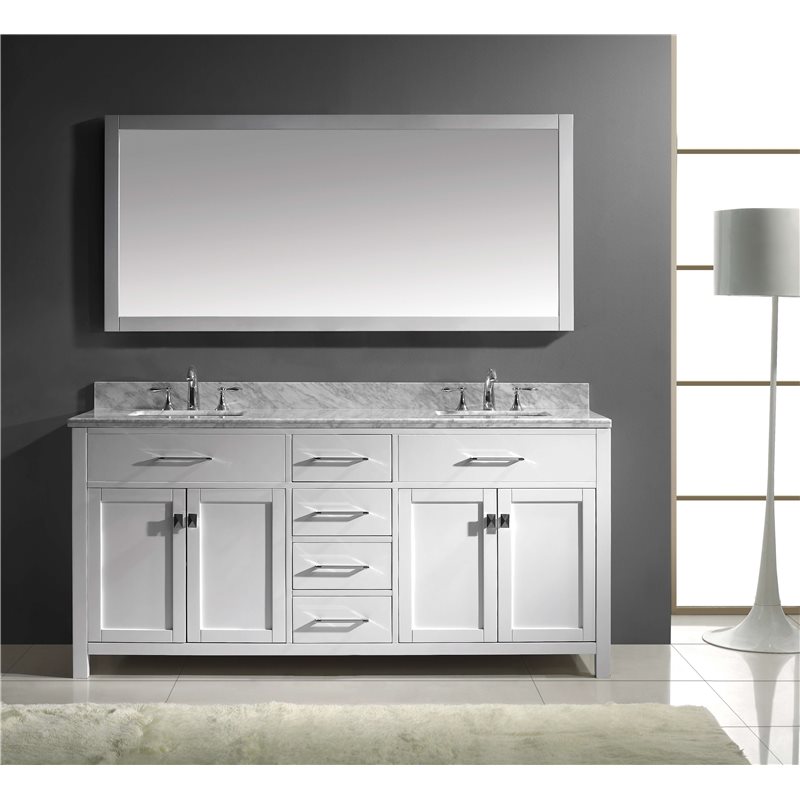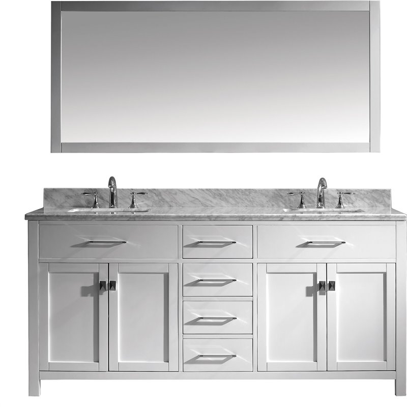 The Caroline collection has a beautiful, clean design that will rejuvenate any bathroom. It is constructed from a high quality solid oak wood, finished in an elegant white and equipped with state of the art, soft closing door and drawer technology. Take notice in the beautiful Italian Carrara White Marble that's sheer size alone guarantees that it will outlast the rest.Virtu USA has taken the initiative by changing the vanity industry and adding soft closing doors and drawers to their entire product line. The premium soft-closing hardware not only increases the safety of the vanity, but also its lifetime reliability.Specifications: • Maximum Dimension: 72 in. W x 22.05 in. D x 34.21 in. H • Main Cabinet (1): 71.18 in. W x 22.05 in. D x 33.46 in. H • Full Framed Mirror (1): 71 in. W x 31.5 in. H • Backsplash (1): 72 in. W x 0.6 in. D x 3.9 in. H Features: • Italian Carrara White Marble Countertop • 0.75 in. countertop edge thickness • White Cabinet Finish • White Full Framed Mirror finish • Solid Oak Wood • Water Resistant Low V.O.C Sealer • Adjustable hinges and slides • 4 Doors with Concealed Hinges • 4 Drawers with Soft Closing Hinges • Designer Chrome Handles with Satin Nickel Highlights & Brushed Nickel Knobs • Under-mount ceramic basin with overflow • Standard 8-inch Widespread Pre-Drilled Holes • Faucet sold separately • Minimal assembly required
