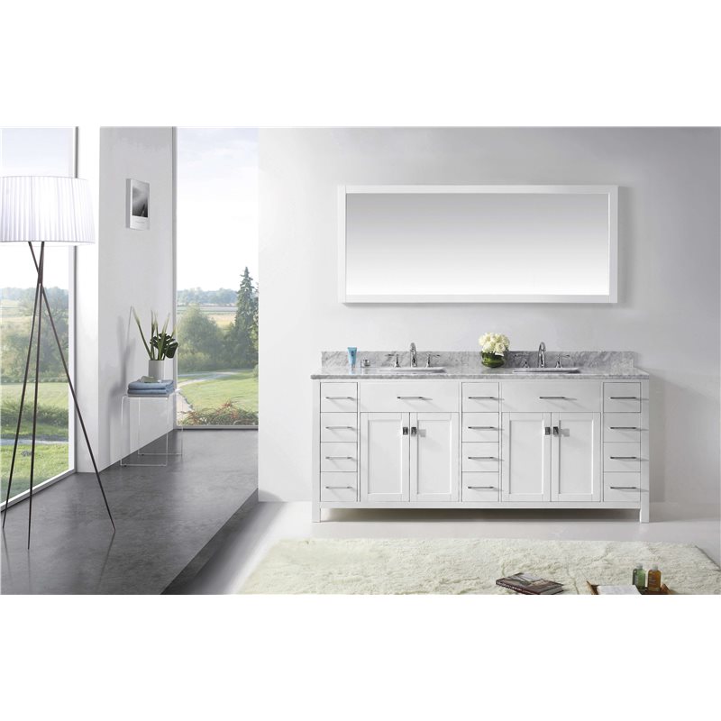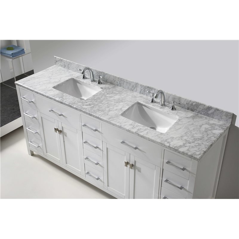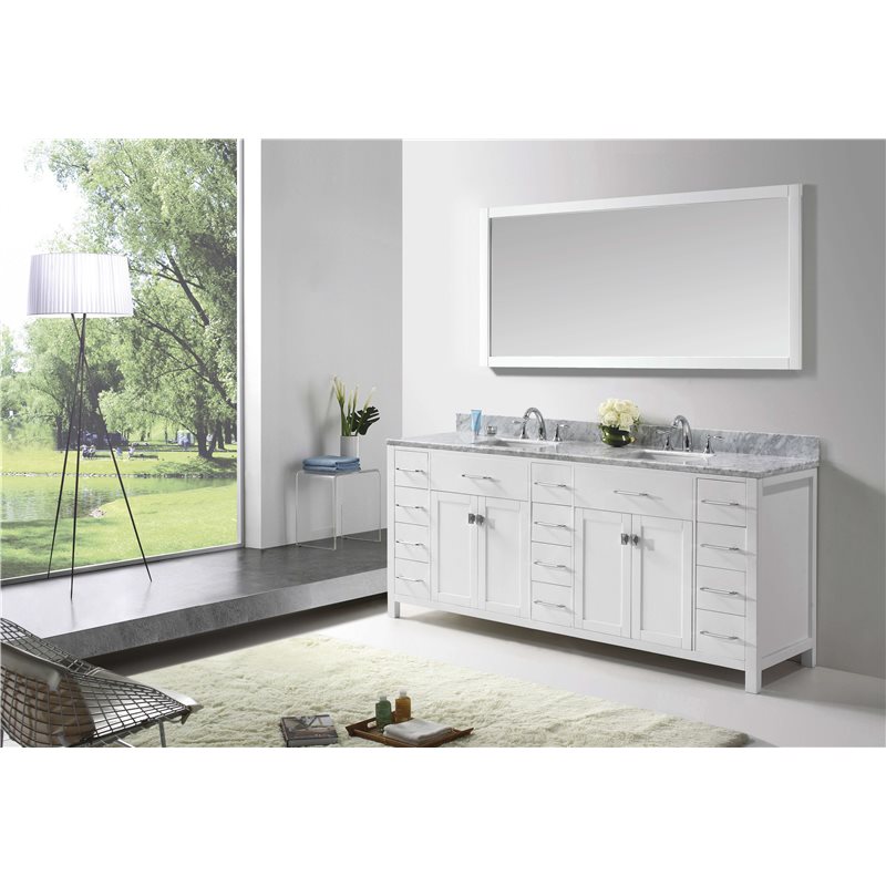 Inspired by the Caroline, the Caroline Parkway vanity offers a clean sleek structure with abundant storage. The vanity is constructed from quality solid oak wood and finished in an elegant white color. The Caroline Parkway also features an Italian Carrara white marble countertop and a matching backsplash. This striking vanity will be a great centerpiece to any bathroom design.Virtu USA has taken the initiative by changing the vanity industry and adding soft closing doors and drawers to their entire product line. The premium soft-closing hardware not only increases the safety of the vanity, but also its lifetime reliability.Specifications: • Maximum Dimension: 78 in. W x 22 in. D x 34.75 in. H • Main Cabinet (1): 78 in. W x 21.5 in. D x 34 in. H • Full Framed Mirror (1): 71 in. W x 31.5 in. H • Backsplash (1): 78 in. W x 0.6 in. D x 3.9 in. H Features: • Italian Carrara White Marble Countertop • 0.75 in. countertop edge thickness • White Cabinet Finish • White Full Framed Mirror finish • Solid Oak Wood • Water Resistant Low V.O.C Sealer • Adjustable hinges and slides • 4 Doors with Concealed Hinges • 12 Drawers with Soft Closing Hinges • Designer Chrome Handles with Satin Nickel Highlights & Brushed Nickel Knobs • Under-mount ceramic basin with overflow • Standard 8-inch Widespread Pre-Drilled Holes • Faucet sold separately • Minimal assembly required