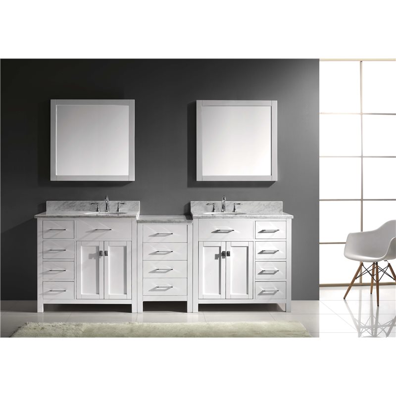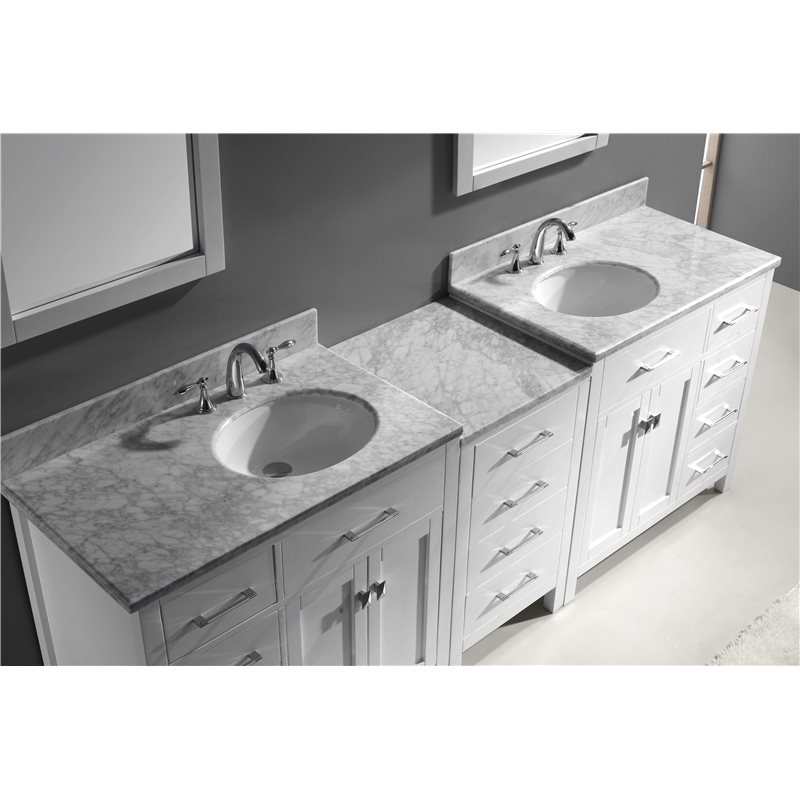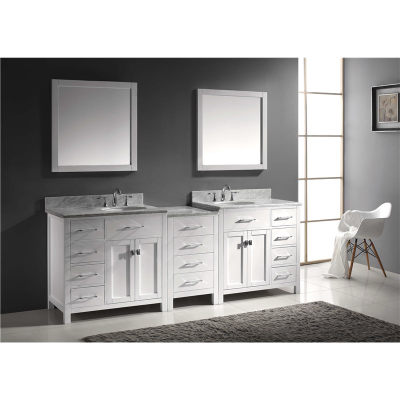 Inspired by the Caroline, the Caroline Parkway vanity offers a clean sleek structure with abundant storage. The vanity is constructed from quality solid oak wood and finished in an elegant white color. The Caroline Parkway also features an Italian Carrara white marble countertop and a matching backsplash. This striking vanity will be a great centerpiece to any bathroom design.Virtu USA has taken the initiative by changing the vanity industry and adding soft closing doors and drawers to their entire product line. The premium soft-closing hardware not only increases the safety of the vanity, but also its lifetime reliability.Specifications: • Maximum Dimension: 93 in. W x 22 in. D x 35.95 in. H • Main Cabinet (2): 35.2 in. W x 21.65 in. D x 33.46 in. H • Middle Cabinet(1): 20 in. W x 21.9 in. D x 33.7 in. H • Full Framed Mirror (2): 35.4 in. W x 31.5 in. H • Backsplash (2): 92.8 in. W x 0.6 in. D x 3.9 in. H Features: • Italian Carrara White Marble Countertop • 0.75 in. countertop edge thickness • White Cabinet Finish • White Full Framed Mirror finish • Solid Oak Wood • Water Resistant Low V.O.C Sealer • Adjustable hinges and slides • 4 Doors with Concealed Hinges • 12 Drawers with Soft Closing Hinges • Designer Chrome Handles with Satin Nickel Highlights & Brushed Nickel Knobs • Under-mount ceramic basin with overflow • Standard 8-inch Widespread Pre-Drilled Holes • Faucet sold separately • Minimal assembly required