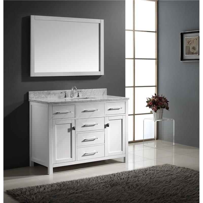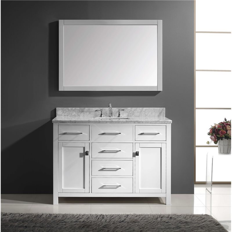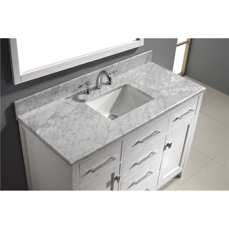 The Caroline collection has a beautiful, clean design that will rejuvenate any bathroom. It is constructed from a high quality solid oak wood, finished in an elegant white color and equipped with state of the art, soft closing door and drawer technology. Take notice in the beautiful Italian Carrara White Marble countertop that's sheer size alone guarantees that it will outlast the rest.Virtu USA has taken the initiative by changing the vanity industry and adding soft closing doors and drawers to their entire product line. The premium soft-closing hardware not only increases the safety of the vanity, but also its lifetime reliability.Specifications: • Maximum Dimension: 48 in. W x 22 in. D x 34.66 in. H • Main Cabinet (1): 47.24 in. W x 21.65 in. D x 33.46 in. H • Full Framed Mirror (1): 45.7 in. W x 31.5 in. H • Backsplash (1): 48 in. W x 0.6 in. D x 3.9 in. H Features: • Italian Carrara White Marble Countertop • 1.2 in. countertop edge thickness • White Cabinet Finish • White Full Framed Mirror finish • Solid Oak Wood • Water Resistant Low V.O.C Sealer • Adjustable hinges and slides • 2 Doors with Concealed Hinges • 5 Drawers with Soft Closing Hinges • Designer Chrome Handles with Satin Nickel Highlights & Brushed Nickel Knobs • Under-mount ceramic basin with overflow • Standard 8-inch Widespread Pre-Drilled Holes • Faucet sold separately • Minimal assembly required
