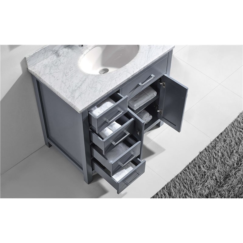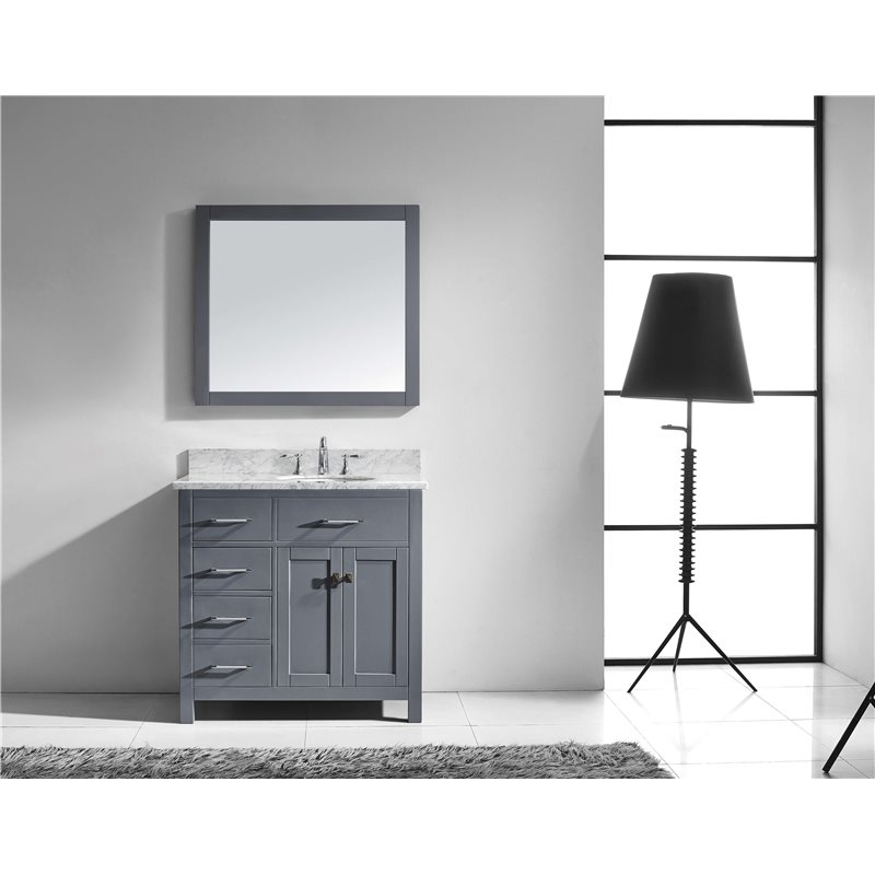 Inspired by the Caroline, the Caroline Parkway vanity offers a clean sleek structure with abundant storage. The vanity is constructed from quality solid oak wood and finished in a grey color. The Caroline Parkway also features an Italian Carrara white marble countertop and a matching backsplash. This striking vanity will be a great centerpiece to any bathroom design.Virtu USA has taken the initiative by changing the vanity industry and adding soft closing doors and drawers to their entire product line. The premium soft-closing hardware not only increases the safety of the vanity, but also its lifetime reliability.Specifications: • Maximum Dimension: 36 in. W x 22 in. D x 34.66 in. H • Main Cabinet (1): 35.2 in. W x 21.65 in. D x 33.46 in. H • Full Framed Mirror (1): 35.4 in. W x 31.5 in. H • Backsplash (1): 36 in. W x 0.6 in. D x 3.9 in. H Features: • Italian Carrara White Marble Countertop • 1.2 in. countertop edge thickness • Grey Cabinet Finish • Grey Full Framed Mirror finish • Solid Oak Wood • Water Resistant Low V.O.C Sealer • Adjustable hinges and slides • 2 Doors with Concealed Hinges • 4 Drawers with Soft Closing Hinges • Designer Chrome Handles with Satin Nickel Highlights & Brushed Nickel Knobs • Under-mount ceramic basin with overflow • Standard 8-inch Widespread Pre-Drilled Holes • Faucet sold separately • Minimal assembly required