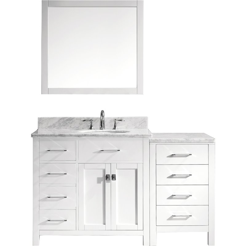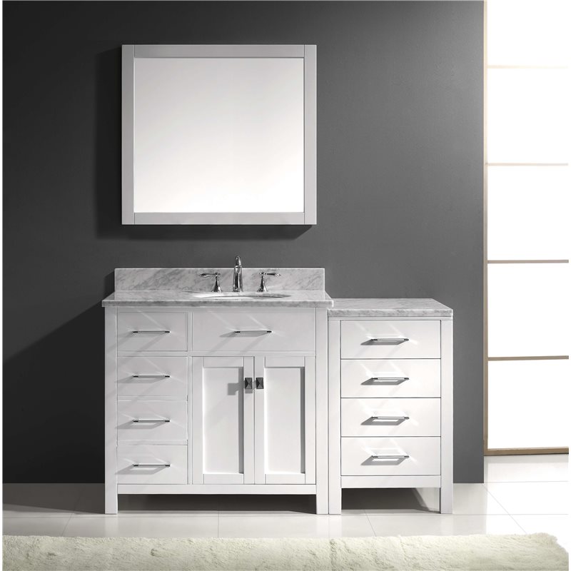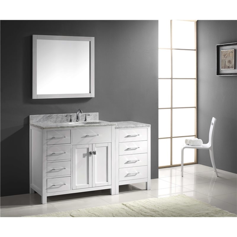Inspired by the Caroline, the Caroline Parkway vanity offers a clean sleek structure with abundant storage. The vanity is constructed from quality solid oak wood and finished in a elegant white color. The Caroline Parkway also features an Italian Carrara white marble countertop and a matching backsplash. This striking vanity will be a great centerpiece to any bathroom design.Virtu USA has taken the initiative by changing the vanity industry and adding soft closing doors and drawers to their entire product line. The premium soft-closing hardware not only increases the safety of the vanity, but also its lifetime reliability.Specifications: • Maximum Dimension: 57 in. W x 22 in. D x 34.66 in. H • Main Cabinet (1): 35.2 in. W x 21.65 in. D x 33.46 in. H • Side Cabinet(1): 20 in. W x 21.9 in. D x 33.7 in. H • Full Framed Mirror (1): 35.4 in. W x 31.5 in. H • Backsplash (1): 57 in. W x 0.6 in. D x 3.9 in. H Features: • Italian Carrara White Marble Countertop • 1.2 in. countertop edge thickness • White Cabinet Finish • White Full Framed Mirror finish • Solid Oak Wood • Water Resistant Low V.O.C Sealer • Adjustable hinges and slides • 2 Doors with Concealed Hinges • 8 Drawers with Soft Closing Hinges • Designer Chrome Handles with Satin Nickel Highlights & Brushed Nickel Knobs • Under-mount ceramic basin with overflow • Standard 8-inch Widespread Pre-Drilled Holes • Faucet sold separately • Minimal assembly required