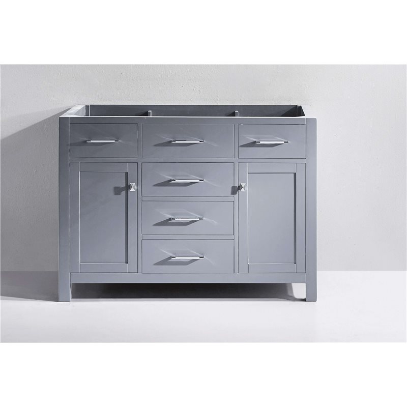 The Caroline collection has a beautiful, clean design that will rejuvenate any bathroom. It is constructed from a high quality solid oak wood, finished in a classic Grey or white finish and equipped with state of the art, soft closing door and drawer technology.Virtu USA has taken the initiative by changing the vanity industry and adding soft closing doors and drawers to their entire product line. The premium soft-closing hardware not only increases the safety of the vanity, but also its lifetime reliability.Specifications: • Main Cabinet (1): 47.24 in. W x 21.65 in. D x 33.46 in. H Features: • Grey Cabinet Finish • Solid Oak Wood • Water Resistant Low V.O.C Sealer • Adjustable hinges and slides • 2 Doors with Concealed Hinges • 5 Drawers with Soft Closing Hinges • Designer Chrome Handles with Satin Nickel Highlights & Brushed Nickel Knobs • Faucet sold separately • Minimal assembly required